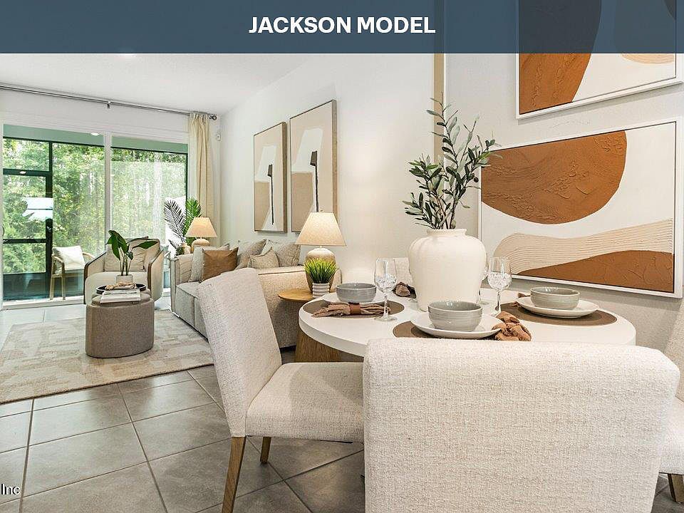 The Jackson townhome is a smartly designed floor plan that proves great living can come in an efficient footprint, offering approximately 1,109 square feet of well-organized space with two bedrooms and 2.5 bathrooms. This inviting two-story layout creates a comfortable balance between open living areas and private retreats, making it ideal for first-time buyers, downsizers, or anyone seeking low-maintenance living. The main level features a welcoming kitchen that opens directly into the living room, creating a connected space that works beautifully for both everyday routines and entertaining. The kitchen includes a generous bar that provides extra counter space for meal prep, casual dining, or hosting guests while you cook. Sliding glass doors fill the living area with natural light, brightening the home and enhancing the sense of openness throughout the day. Upstairs, the primary bedroom offers a relaxing escape with a spacious walk-in closet.