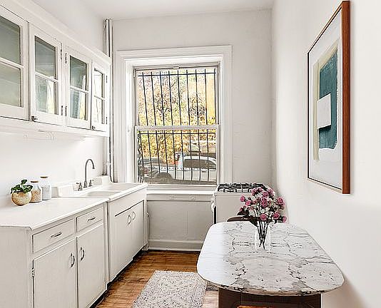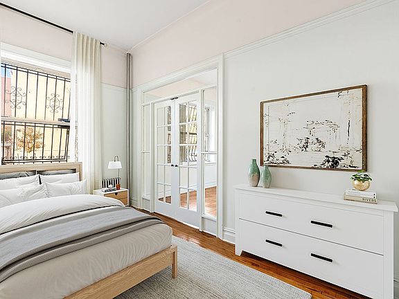 Oversized windowsNatural lightCozy bedroomAntique pedestal sinkPre-war charmWindowed kitchenFrench doors