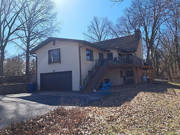 Custom built A-Frame/Ranch home with open floor plan. Large great room with floor to timbered ceiling stone fireplace giving it a lodge like feel. The kitchen has custom built solid wood cabinets with spacious pull out shelves for pantry. The eating area opens to a large deck which has a beautiful view of the Missouri and Mississippi River valley and the Alton bluffs.