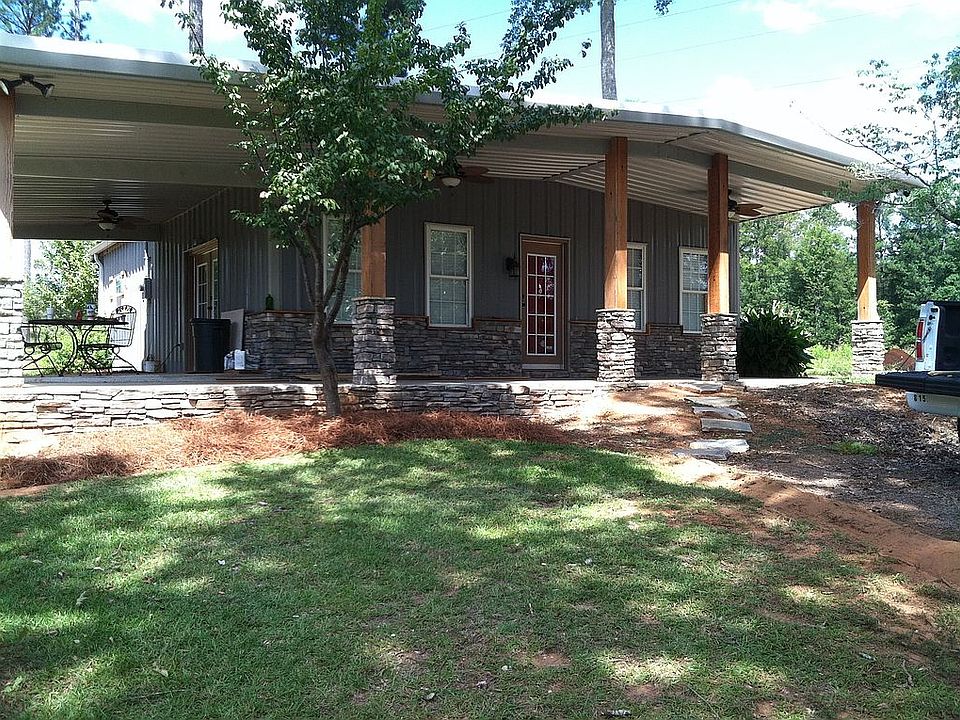Home is situated in a peaceful cove and very private at the end of a cul-de-sac. Enjoy the lake view from your rocking chair on the large covered porch. Across the lake from the property is wooded and water at the end of the dock is deep. A 26x30 carport is large enough to house your vehicles and boat. A12x16 workshop is also included. This property is a deeded lot not a lease lot. 208 foot of waterfrontage with seawall and dock. Kitchen has lots of cabinets and home is basically maintenance free with metal siding and tile flooring.