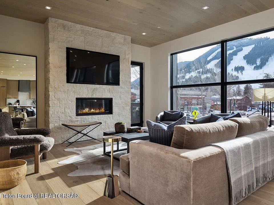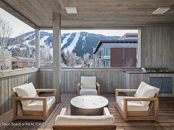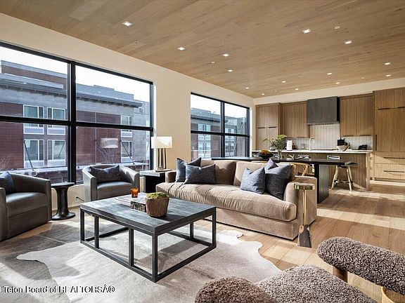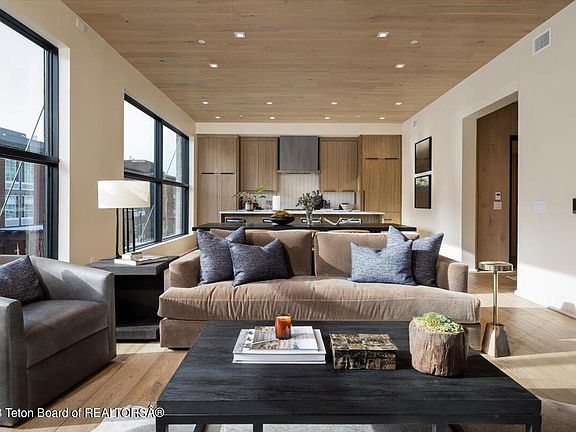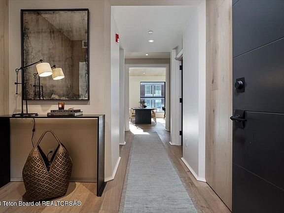 Arts District West is the perfect blend of modern convenience and artistic elegance. Created to enjoy for a week, a month or forever, this condominium offers stunning mountain views through floor-to-ceiling windows. Equipped with Wolf Sub-Zero appliances and advanced security, it caters to both short stays and permanent residencies. Offered furnished, the space is adorned with works by artists like Ansley Rivers West and Todd Mossman, enhancing its allure. Comfort meets style with a mohair sofa and custom metal worked furniture. The living room's sheepskin chair reflects a blend of Scandinavian and Brazilian design, while the dining area features Hans J. Wegner's Wishbone Chairs. Residents can unwind in privacy after a day of exploration, making this condo the ideal Jackson Hole retreat.