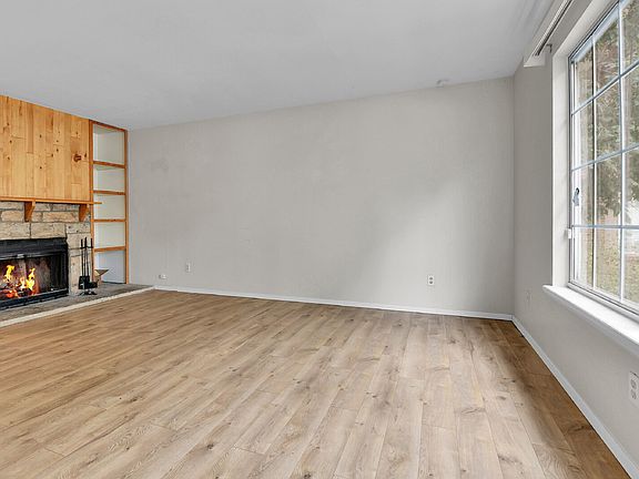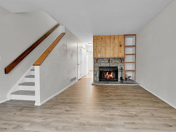 This 2-bedroom, 2.5-bathroom end-unit condo offers an open and functional layout with great features throughout. The living room has plenty of natural light from the front window and a wood-burning fireplace. The kitchen includes all major appliances, with the dining space nearby and a laundry closet with an in-unit washer and dryer. A small outdoor patio is located just off the kitchen. Both bedrooms have vaulted ceilings, large windows, and their own private bathrooms. Additional features include central A/C and one assigned parking space.