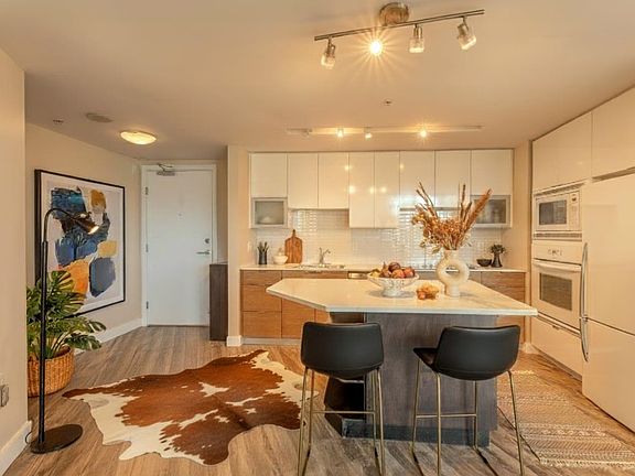 Corner suiteFloor-to-ceiling windowsModern kitchenQuartz countersSleek cabinetryGas cooktopPrivate balcony