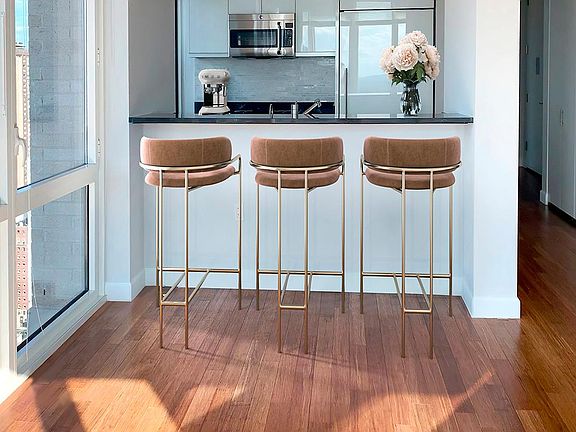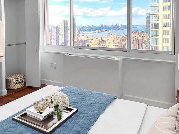 High floor corner view, floor-to-ceiling windows, open custom windowed kitchen with natural granite breakfast bar and custom glass front cabinetry, GE series stainless appliances, king size bedroom, windowed large marble bathroom, full size washer and vented dryer, bamboo plank floors, building wide filtered water system, rooftop pool and furnished deck, fitness center, lounge with kitchen, pet friendly, steps to Central Park. See Website for FHA Compliance Info