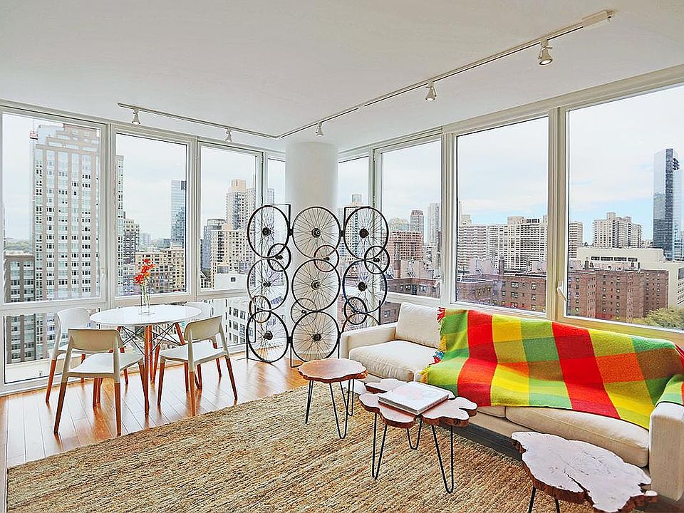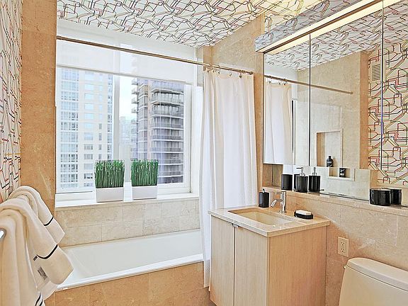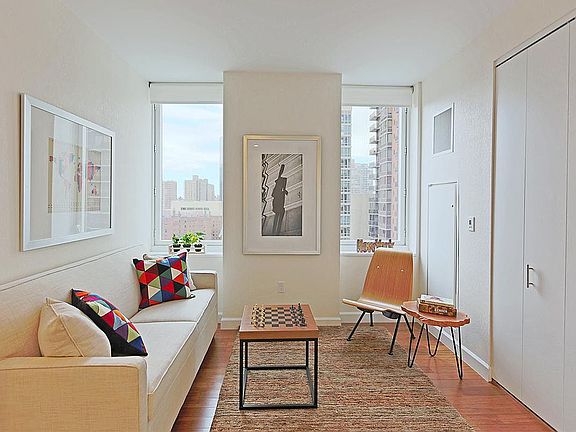 Large living room with open kitchen, natural granite breakfast bar, GE Caf stainless appliances, windowed queen size sleeping area, full size washer and vented dryer, amazing closet space, bamboo plank floors, filtered water system building wide, rooftop pool, lounge, fitness center, pet friendly, steps to Central park and Lincoln Center. See Website for FHA Compliance Info