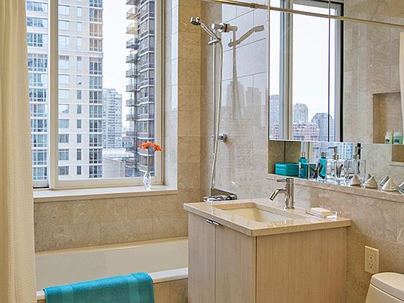 High floor corner view, floor-to-ceiling windows, open custom windowed kitchen with natural granite breakfast bar and custom glass front cabinetry, GE series stainless appliances, king size bedroom, windowed large marble bathroom, full size washer and vented dryer, bamboo plank floors, building wide filtered water system, rooftop pool and furnished deck, fitness center, lounge with kitchen, pet friendly, steps to Central Park. See Website for FHA Compliance Info