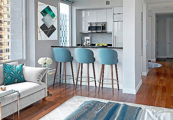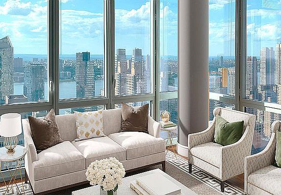 Stunning corner view, floor-to-ceiling windows, open kitchen with natural granite counters and marble backslash, GE series appliances, white glass Scavolini custom cabinets, king size bedroom, full size washer and vented dryer, roof top pool with furnished outdoor terrace, lounge with kitchen, fitness center all private for tenants, pet friendly, rent stabilized See Website for FHA Compliance Info
