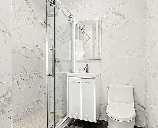 The bedroom offers brilliant light and a large closet. The bathroom is clad in Bianco Statuario and Fiorana Onyx tile with Kohler polished chrome fixtures, wall-mounted commode, and clean-lined vanity with undermount sinks. A glass-enclosed shower completes the composition.