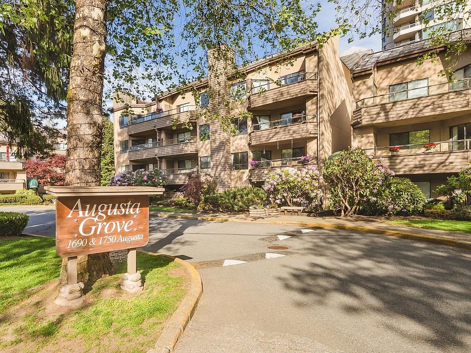 AUGUSTA GROVE - Spacious 1 bed/den/1 bath with open concept living & dining room. Updates include kitchen boasting granite counters, cabinets, backsplash, sink and s/s appliances. Other updates include bathroom fixtures, vanity and surround and upgraded flooring thru-out. 2 balconies. Spacious master bedroom. Secured underground parking and storage, pets & rentals allowed. Very peaceful outlook mature trees. Excellent location, close to golf course, SFU, Parks, trails & transit & shopping.