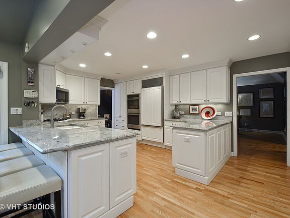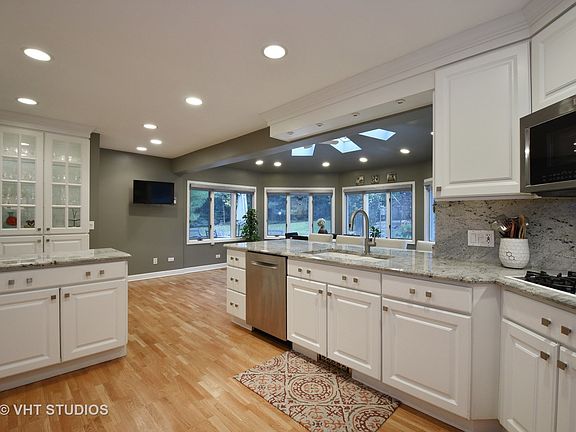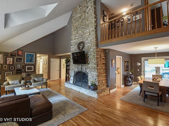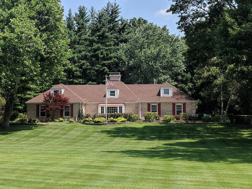 Its the stunner you've been waiting for! This home is a showpiece, entertainers dream. Take in the elegant view winding up the drive to this brick 2 story, w/stone and paver walkway. Greet guests in the foyer leading to impressive living room w/soaring ceilings &skylight. Spectacular floor to ceiling stone fireplace, hardwood floors, great flow to the formal dining room and kitchen. Luxury kitchen with crisp white cabinets, gleaming beveled granite counters and backsplash, and lighted display cabinetry. Stainless steel appliances, double oven, prep area peninsula for your holiday buffet! Light filled breakfast rm/family rm surrounded by windows, step out to the party patio & up to the gated in ground pool w/water slide. 3 generous first floor bedrooms, with master suite & additional bedroom upstairs, full baths all 3 levels. 1st floor office tucked away. Full finished basement w/2nd FP, HUGE storage area, built in cabinetry. All this on a lush wooded estate, over 3 acres or privacy!