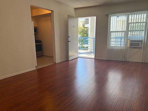 Apartments include a full kitchen with generous counter and cabinet space, stove, oven, microwave, and refrigerator as well as ample closet space. Water and trash are included. Units feature hardwood flooring, air conditioning, and pet-friendly options for cats or small dogs (with management approval). Building amenities include an on-site laundry room and secure underground parking available for an additional $100 per month.