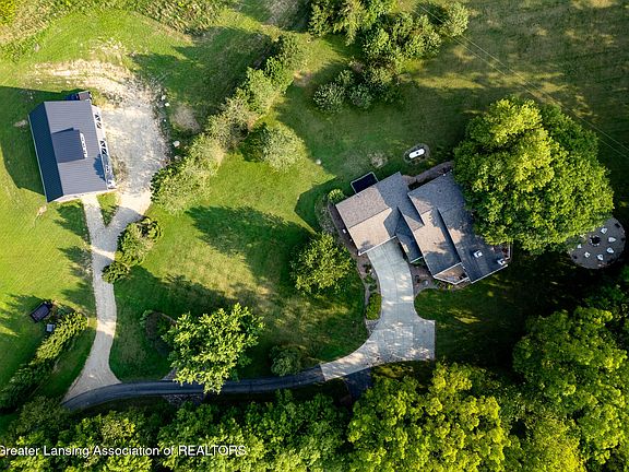 Welcome to 1750 Pinch Hwy in Charlotte, MI! This stunning contemporary home offers 4 bedrooms, 3 bathrooms, and 3,588 square feet of finished living space on nearly 20 acres of scenic beauty, including fields, woods, fruit trees, and abundant wildlife. As you arrive, a winding asphalt driveway leads you over a bridge to the front of the home, passing by a new 2023 40x56 pole barn. The barn features 16x56 storage above, insulated 10-foot overhead doors, in-floor heating set up and a standing seam metal roof. As you drive a bit further the home comes into view. Upon stepping inside, you'll be greeted by a grand entryway with an open staircase and soaring cathedral ceilings. The gourmet kitchen and dining area boast hardwood floors and ample natural light from numerous windows. The dining room flows seamlessly into the living room, with both spaces offering access to the expansive deck, perfect for entertaining or enjoying the outdoor views.