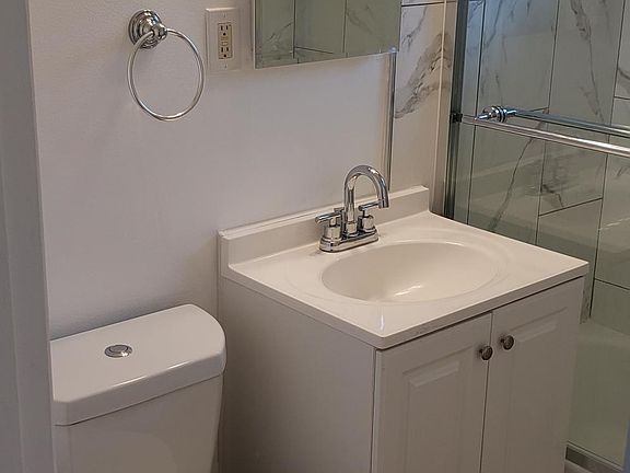 A new fully remodeled bathroom awaits with a brand new bathtub, glass shower door, vanity with storage, and luxurious shower head. Right outside the bathroom is a big closet for all your storage.