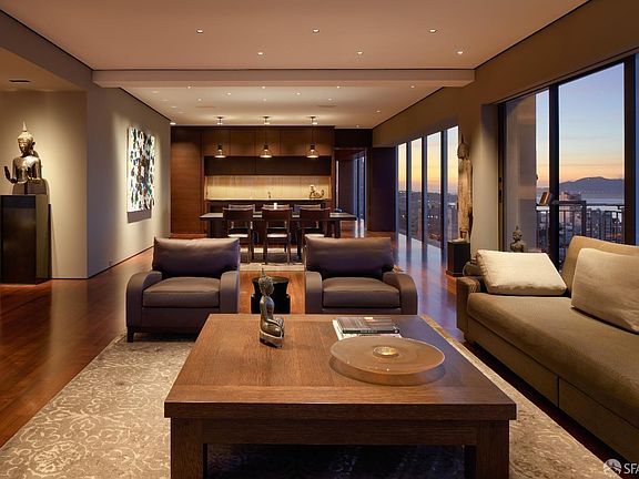 This extraordinary two-bedroom Russian Hill apartment atop one of San Francisco's best buildings features floor-to-ceiling windows offering near-360 degree, day-and-night cinematic views of four bridges & myriad San Francisco landmarks. Designed & built of the finest materials with exquisite attention to detail, the apartment features floating ceilings, walnut floors, & extensive custom millwork throughout. The primary bedroom is a walnut-clad jewel box, with a walk-in closet/dressing room & bath of Calacatta marble. A gallery leads to the ensuite guest bedroom. A large second kitchen features custom wenge cabinetry, dishwasher, ice-maker, double ovens, two wine refrigerators & abundant storage. Three large balconies face north, south & west. Amenities include in-home laundry & two parking spaces. Built in 1964, 1750 Taylor Street (known as the Royal Towers) is one of Northside San Francisco's most prized addresses. Residents enjoy a newly remodeled fitness center & a glass-enclosed, heated swimming pool with a retractable roof. On the first floor are a majestic owners' club room with soaring ceilings & breathtaking landmark views, library & conference room. The 24/7 attended lobby, attentive staff & professional, on-site management create an unsurpassed residential experience.