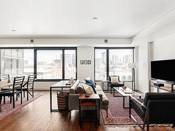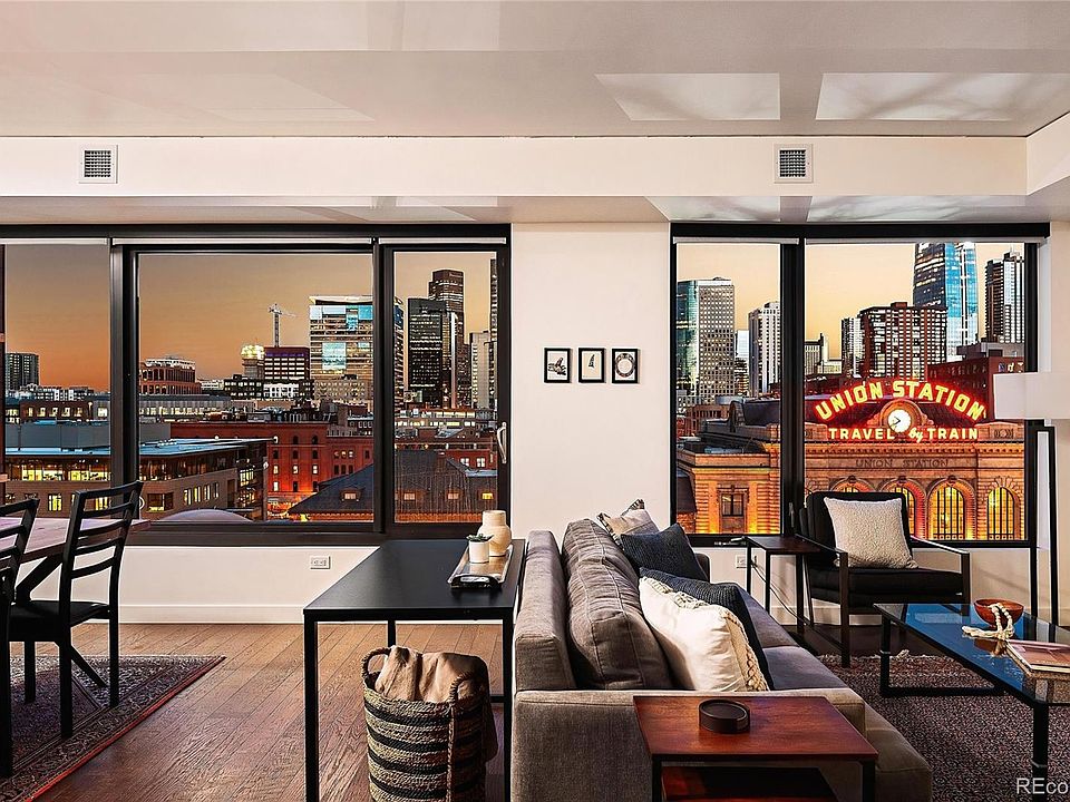 Welcome to your stunning 1 bedroom, 1.5 bathroom condo at the highly sought-after Coloradan in the heart of Downtown Denver! This unit boasts the best direct views of Union Station for a one bedroom, offering a front-row perspective of one of Denver's most iconic landmarks. As you step through the front door, you’ll immediately notice the spacious long hallway, which is perfect for showcasing your artwork, and modern mudroom with a convenient coat closet. The bright and inviting living room offers panoramic views of the bustling city below and remote controlled shades when you are ready to unwind. The sleek and modern kitchen features stainless steel appliances, quartz countertops, and plenty of storage space for all your culinary needs. The bedroom continues to provide a stunning view of Union Station and includes glass French doors with shades and walk-in closet with laundry. The adjacent bathroom features a double vanity and a large wet room with shower and soaking tub. You'll also have the added convenience of an additional bathroom for guests. An added bonus of this unit is the desirable storage locker located on the same floor, providing a perfect place to store your skis, bikes, or holiday decorations without leaving the floor. Living at the Coloradan comes with a host of amenities, including a fitness center, rooftop pool, hot tub, outdoor kitchen, community library and club room. And with Union Station just steps away, you'll have easy access to some of Denver's best restaurants, shops, and entertainment venues. Whole Foods is conveniently located just across the street, and for those who love to travel, catching a train to DIA is a breeze with the station right outside. This furnished condo is ready for you to move in and make it your own. Don't miss this opportunity to own a stunning and convenient condo in the heart of Denver. Schedule a tour today and experience all the best that Denver has to offer!