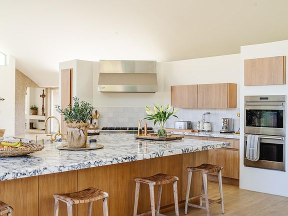 Concrete and steel architectural masterpiece in Topanga Canyon! Meticulously designed with fire safety in mind, this completely remodeled house combines designer style with sustainability and safety. No wood was used in the construction, and the property is equipped with fire shutters, solar panels, private well, 10,000-gallon water storage tank and water softening/filtration systems. Set behind gates on an approximately 5.8-acre lot, This serene, secluded estate features gorgeous designer finishes throughout. The breathtaking kitchen and living room have retractable glass doors that open to the backyard, offering a solar-heated saltwater pool, grassy lawn, and covered outdoor kitchen and dining area. The luxurious primary suite also opens to the backyard and features a heavenly bathroom with dual sinks, large rainfall shower, soaking tub and custom vanity. Plus there are 4 additional bedrooms, 3 bathrooms, a spacious den, gym, and 2 huge garages with soaring ceilings that could be used as an art/music studio, production space, gallery or to house a prized car collection.