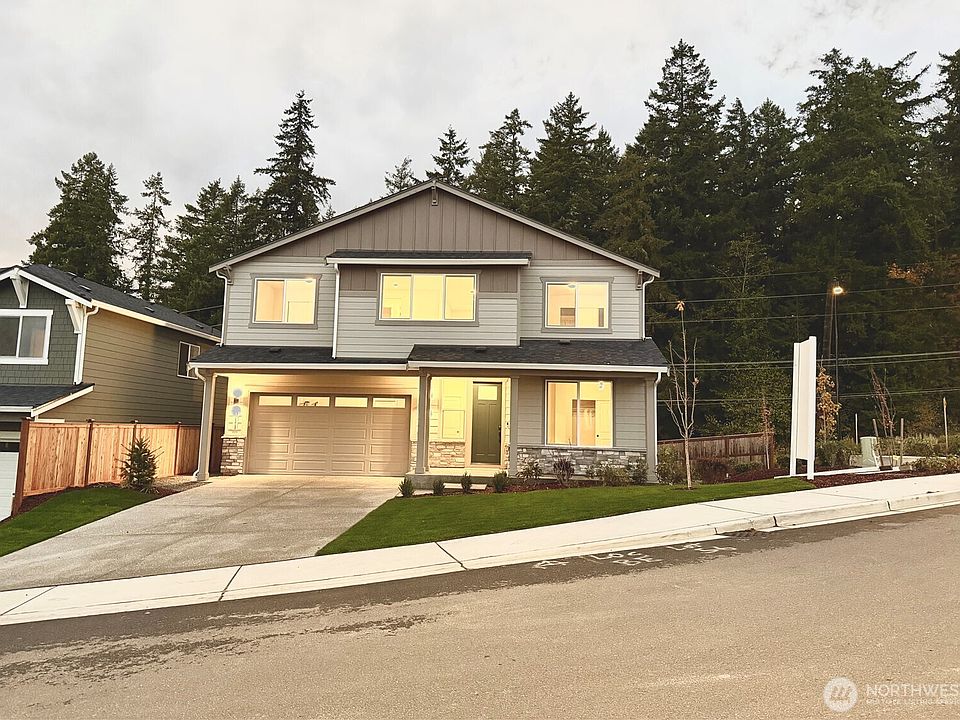 Trending for a September Closing - 2448sf 5BR+ Loft/2.75BA Warren plan Lot 56 w/main-floor guest BR + ¾ bath. Gourmet island kitchen boasts 42” white soft-close cabs, under-cab lights, tile backsplash, 5 burner GAS cooktop w/hood, d/w & wall oven/micro. Get cozy by the great rm GAS fireplace enjoy the covered front porch or rear covered patio. A/C, Hot Water Recirc Pump, Quartz counters, Laundry w/sink & cabs, primary 5-piece bath w/heavy frameless glass, Showers & tubs tiled 2 ceiling, 8' tall garage & entry doors, dimmers, LVP, wrapped windows. Minutes 2 Bainbridge/Kingston ferries & steps 2 NK schools & downtown Poulsbo waterfront shopping/dining! Broker 2 register buyer b4 or@1st visit