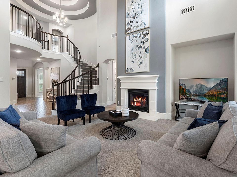 Experience luxury living in this beautiful Preston floor plan by Westin, nestled in the heart of Artavia. Featuring 4 bedrooms & 3.5 bathrooms, this home offers a grand tiered rotunda entry, a stunning wrought iron staircase, & soaring ceilings. The chef-inspired kitchen features quartz countertops, stainless appliances, and a spacious island perfect for entertaining. Relax in the living room with a cast stone gas fireplace and large windows that flood the space with natural light. To add the final touch to the first floor, is a private study, formal dining, a luxurious Primary suite with an ensuite bathroom & a walk-in closet. Upstairs, enjoy a game room & a media room, plus 3 large bedrooms & 2 full bathrooms. Step outside to a generous backyard offering a covered patio, a complete leaf guard gutter system, an oversized garage & a whole-home generator to complete the home. Enjoy a 5-acre lake, splash pad, jogging paths, & fitness center, all just minutes from shopping & major roads.