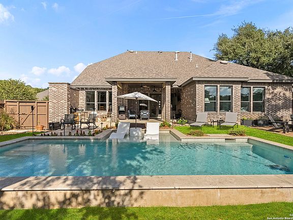 Luxury and location await in this stunning model style home in the prestigious Shavano Highlands community. Greenbelt privacy create your private backyard paradise-complete with a covered patio, outdoor kitchen, a resort-style pool with sundeck and no backyard neighbors. Meticulous landscaping, mature oak trees along with designer lighting and finishes throughout, make this property a real showstopper. Step through the foyer onto beautiful wood-inspired tile flooring, past the elegant staircase and custom wet bar, and into the main living area featuring soaring ceilings and an impressive stone fireplace. The gourmet kitchen is a chef's dream with stainless steel appliances, gas cooking, and an oversized island perfect for gatherings. The expansive primary suite is privately situated with a spa-like ensuite, dual stone vanities, his-and-hers closets, and direct access to the utility room. A secondary guest bedroom downstairs provides guests main level living or doubles as a private study. Upstairs, enjoy a spacious game/media room, a private study/office nook, plus three additional bedrooms. This immaculate home offers luxury living with proximity to Salado Creek Trail System, shopping, restaurants, and award winning schools.