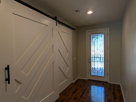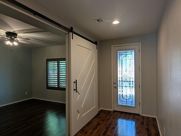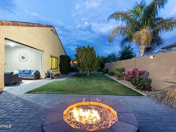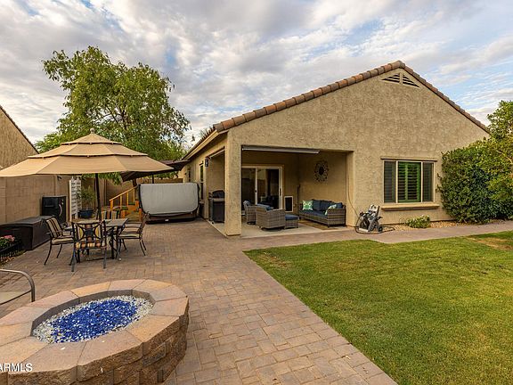 ASSUMABLE 2.875% VA LOAN! Consult your lender for qualifications. Make yourself at home in this charming single-level residence in Desert Oasis! Owner has had to relocate and has priced their home to sell. This low maintenance, upgraded 3 bed/2 bath home is better than new and chock full of upgrades, including new Hunter Douglas plantation shutters throughout, a beautiful bonus room or den with wood flooring and custom barn door, and an upgraded, oversized patio sliding door, a new Samsung range with built-in air fryer. The backyard oasis includes lush landscaping and a natural gas firepit, Jacuzzi hot tub (includes large umbrella, cover, steps and equipment box), a dog run w/artificial turf, roller shades/misters/fans/lights on patio, roller shades and storage shed. Garage.... This model has a 3-car tandem garage to hold a third vehicle or provide additional storage. Did I mention the SOLAR? Leased solar makes electric bills very affordable. Check out the Document section for home upgrade list and monthly utility bills. Experience the Desert Oasis Community with Lavish community parks, community pool and is located close to the 303 and Grand Ave.