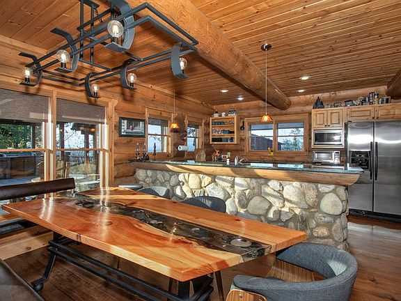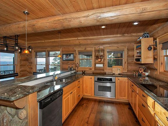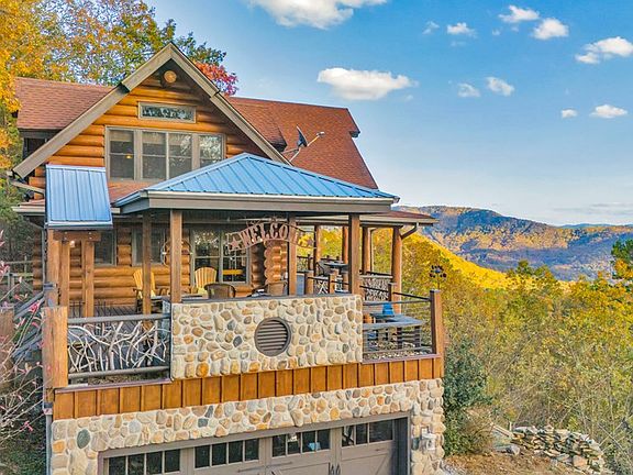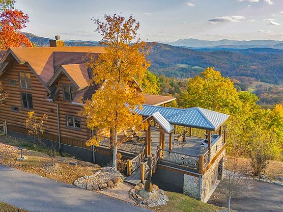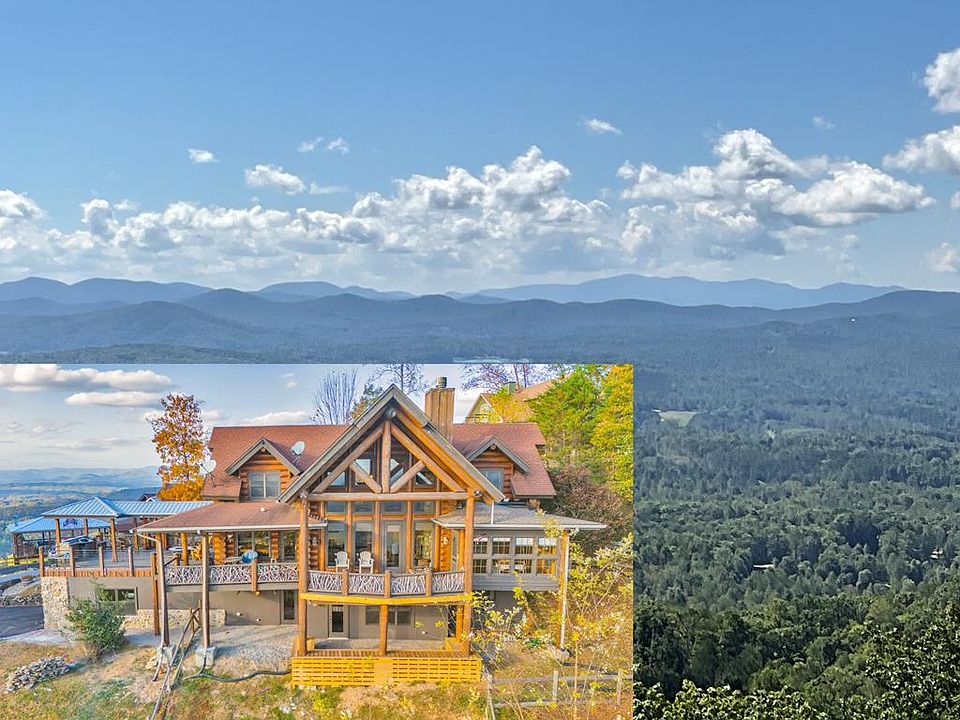 Welcome home to coveted Five Forks! This stunning 2-bed, 3-bath Canadian Log chalet blends rustic charm with luxurious details, all set against the backdrop of BREATHTAKING MOUNTAIN VIEWS. You can see Lake Nottely! From the moment you arrive, the giant logs and custom touches throughout make this home truly extraordinary. Step onto your party porch with an outdoor kitchen and firepit, ideal for entertaining or just relishing in the glorious views. Step inside, and you'll immediately feel the warm ambiance of the kitchen and dining area, where rich wood floors and ceiling beams offer a glimpse of the exceptional craftsmanship throughout the home. The kitchen has granite counters, stainless steel appliances, and lots of windows that flood the space with light. The adjacent laundry and pantry offers convenience. The heart of the home is the living room, featuring a floor-to-ceiling river rock fireplace with a live-edge mantel and woodbox, complemented by massive chalet windows. Vaulted tongue-and-groove ceilings and exposed wood beams create an expansive, inviting feel, with direct access to the deck. The main-level Master bedroom is a tranquil escape with a spacious walk-in closet and attached sunroom with two doors leading outside. The Master bathroom is complete with a beautifully tiled shower and granite countertops, providing a spa-like experience. Upstairs, the loft opens up with even more mountain views, leading to the second bedroom and bathroom, both echoing the chalet's stunning wood beams, vaulted ceilings, and mountain laurel railings. Downstairs, the lower level is fully finished, offering a large rec room with another full bathroom and outside access to your patio. This versatile area could be made into anything you need, adding tremendous functionality. You also have access to your extra deep garage with room for vehicles and storage. With luxury, style, and unmatched mountain views, it's beckoning for you to make it your log home in the mountains!