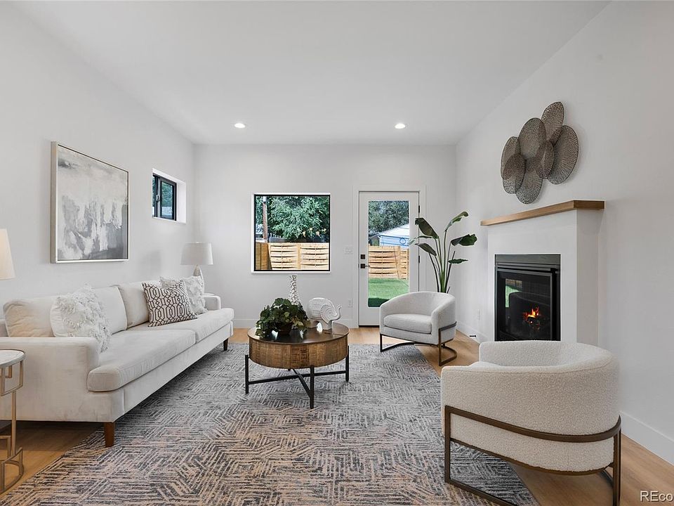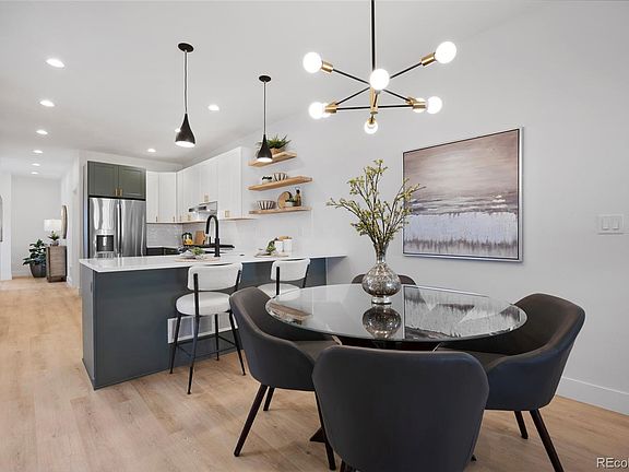 Located just minutes from vibrant Sloan's Lake, this stunning three-story new construction blends modern elegance with exceptional design. Offering 3–4 bedrooms, 4 bathrooms, and remarkable attention to detail, this new home is a rare find. Step into a chef-inspired kitchen featuring rich, two-toned cabinetry, quartz countertops, subway tile backsplash, beautiful wood shelving to display your favorite dinnerware or artwork, peninsula with seating for 4, custom walk in pantry and premium gold/black lighting fixtures. Dining Room is adjacent to the Kitchen to enjoy meals with family and friends. Two spacious living areas, one with a wet bar, provides ample space for entertaining and relaxation. Main Living Room is adorned with gas fireplace with access to the covered patio and lush, green back yard. Upper living space does have a closet, so could be your 4th bedroom. Enjoy spectacular Denver skyline views or peekaboo mountain views from the fabulous rooftop deck, complete with a show-stopping barreled cedar plank ceiling. The luxurious primary suite boasts a private balcony, a tranquil, spa-inspired 4-piece bath and an expansive custom walk-in closet. The two, generous sized secondary bedrooms are great for guests or if you conduct business from home, that perfect work space. This well designed property offers laundry room conveniently located on the second floor plus a wonderful niche to cozy up with your favorite book! Additional highlights include beautiful black framed windows, Unique, yet Genius Carport, extended to protect even your oversized vehicles and EV port, Professionally landscaped, front and back yards, fenced yard, Flexible floor plan, close proximity to downtown, popular local restaurants, boutique shops and so much more. The blend of sleek and modern elegance awaits in these amazing Move In Ready, New Homes.