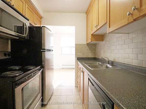 Large one bed and one bath apartment. Enjoy spacious room in the well maintaining building. Kitchen features a double sink, stainless steel appliances (B/I microwave, fridge, stove), backsplash and plenty of cabinet space. Within walking distance of golden mile shopping area, school, parks and numerous restaurants. DVP nearby, TTC bus stop on front step. Coined laundry in building. 1 parking available for $100/month