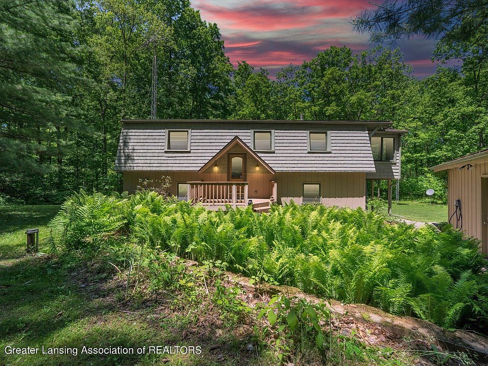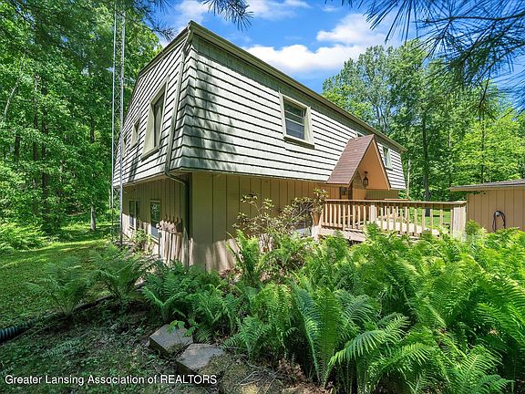Great 4 bed 2.5 bath raised ranch situated on 3.5 acres in low tax Windsor Twp! Enjoy your own private oasis surrounded by towering hardwoods and abundant nature. Upper floor features 2 bedrooms, master bath, guest half bath in an open floor plan with floor to ceiling windows and skylights. The back huge deck faces west and takes full advantage of the awesome views. Lower level has mudroom/laundry room, 2 additional bedrooms, full bath and a spacious family room with slider to the maintenancefree trex deck outside lower level. Other features include all new carpet throughout, vinyl siding, high efficiency propane furnace and central air .Property also has 2 car detached garage as well as a pole barn for additional storage and hobbies-Rare to find such a private wooded setting less than 10 miles from downtown Lansing and MSU!