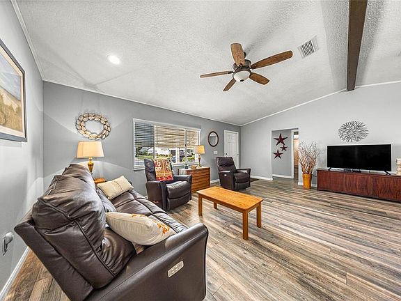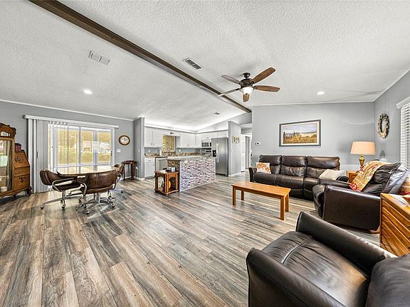 Welcome to Florida living at its best in the Spruce Creek South 55+ community! This 3 bedroom 2 bath home boasts over 1450 Sqft of living space. The home has been remodeled to feature Luxury Vinyl flooring throughout the main living space with tile floors in the bedrooms and baths. The kitchen has been updated with stainless steel appliances and granite counter tops. Both baths have matching granite vanities. The primary bath has a remodeled walk in tile shower perfect for easy access. There is a large Florida room off the dining room that has vinyl sliding windows and a portable A/C unit allowing for year round enjoyment. The yard is nicely landscaped with a fenced back yard. The 2 car garage is features a Bluetooth garage door opener, and there is a separate golf cart garage in the back of the home providing plenty of extra storage space. The community of Spruce Creek provides a long list of amenities and activities along with a secure guarded entry for extra piece of mind. Located South of Ocala and just North of The Villages there are and less options for shopping, restaurants and entertainment close by. Call today to schedule a showing.