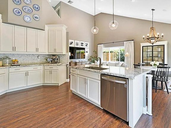 Stylish herringbone backsplashGuest half bathAspen white granite countertopsOpen floor planPlenty of natural lightCustom solid wood cabinetsWalnut wood laminate flooring