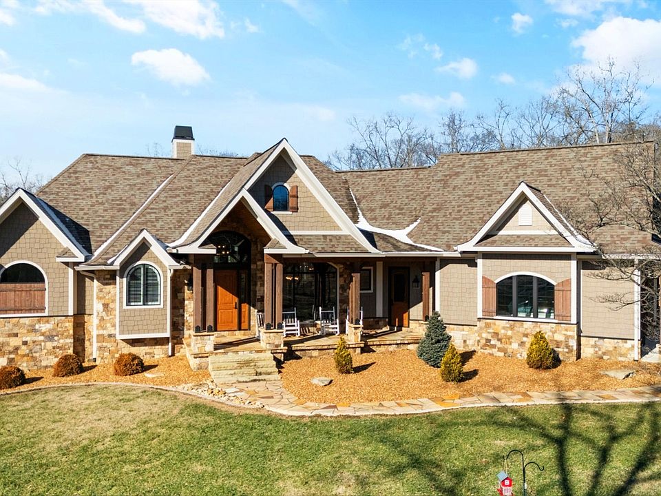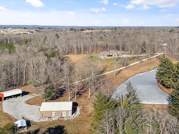 Discover unparalleled privacy and craftsmanship in this custom-built estate on 45.69 acres with a ~½ acre stocked pond. This gated property offers unmatched privacy for a serene, peaceful lifestyle. The exterior is stone and Hardie plank with freshly stained cedar accents. The living room features an open floor plan with soaring reclaimed wood ceiling and a stone gas fireplace. The custom kitchen with extensive cabinetry, wine fridge, and a walk-in pantry includes 2 full-size refrigerators. The main level owner's suite features a spa-like retreat, boasting a freestanding soaking tub, tiled walk-in shower, and a barrel wood ceiling. Retreat to the second floor, offering a private suite with a bedroom, bathroom, kitchenette with a 3rd refrigerator, microwave, sink, dining area, and an enormous bonus room—ideal for guests or multigenerational living. Outdoor enthusiasts will relish the three wonderful porches, including a screened dining area with a stone fireplace, and access trails winding through wooded acreage. The property has a 40'x60' barn with horse stables, and tack room, fenced livestock area, a workshop space, supplied with water and 200-amp electrical service and outbuildings for versatile use. Modern conveniences include a whole-house Generac generator, dual fuel heat pumps, fiber optic internet, and a monitored security system, and exterior cameras, encapsulated crawl space, blown-in foam insulation from top to bottom, and electric, natural gas, water. With a 5-car garage, low-maintenance landscaping, and Greenbelt status, this home perfectly blends luxury, practicality, and natural beauty. Conveniently located just 12 minutes from schools, shopping, and healthcare, this property combines functionality, and natural beauty in one exceptional package.
