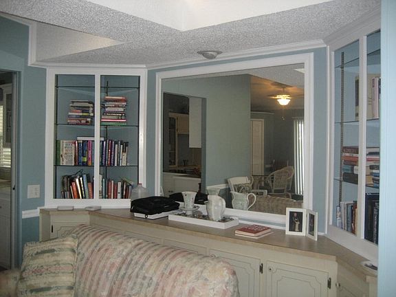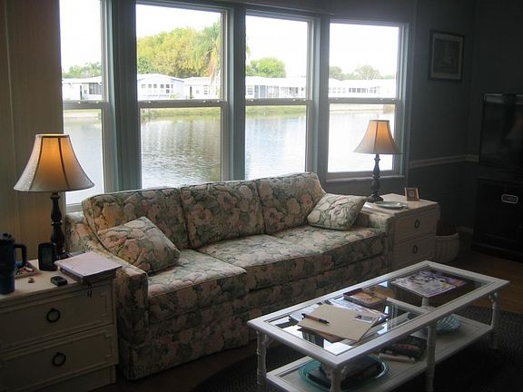 Seminole Cove- 55+ Community- Clubhouse- Pool.Waterfront view of the Beautiful lighted fountain at night! Gorgeous 2 spacious Bedrooms with king beds and 2 Bath with large master bath suite- Walk-in shower.(Handicap) Home completely updated through-out. New kitchen cabinets- Wet Bar for entertaining. Double Fireplace- Real wood burning. New plumbing & Electrical updated outlets. Seawall plus an enclosed Sun room and private side porch for all your entertaining needs. Utility/workshop. Covered carport.Did I mention newer windows.
