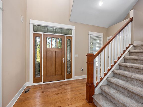Classic craftsman style banisterTwo story foyerNewer carpetingJet tubDining areaWalk-in pantryOversized two stall garage