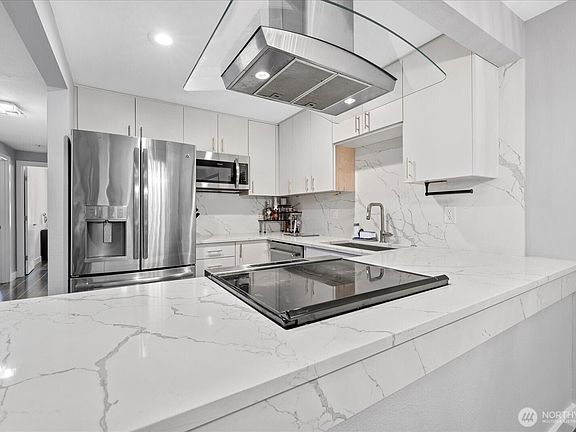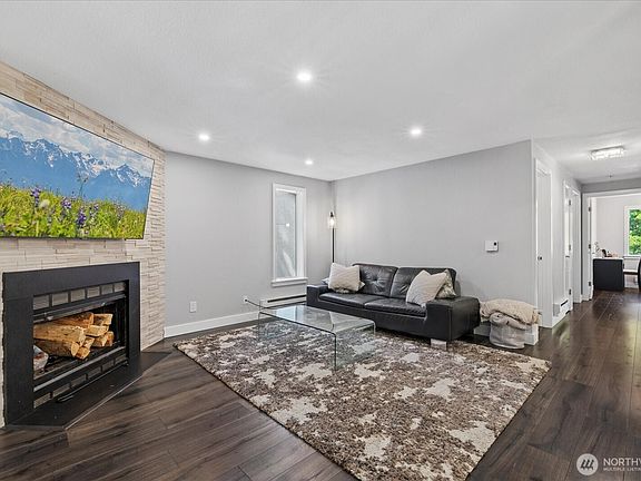Discover this fully renovated 2nd floor condo in the serene Cascade Park community! Enjoy modern updates throughout, including LVP flooring, fresh paint, and custom lighting. The kitchen features shaker cabinets, quartz countertops, a waterfall edge, full-height backsplash, and stainless steel appliances. Relax by the custom 3D tile fireplace with Absolute Black granite or unwind in the spa-like bath with heated floors and dual shower heads. Includes USB/USB-C outlets, custom closets, private deck, covered parking, and easy access to shopping, dining, and I-405