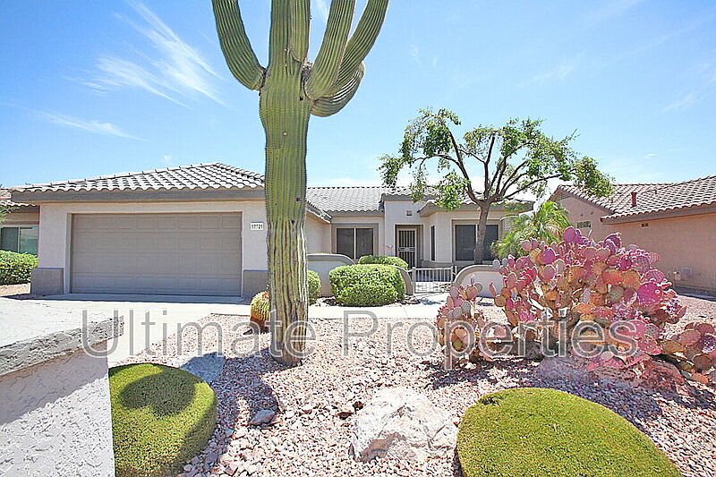 2 bedroom + office/den, 2 bathrooms located in the age restricted community Sun City Grand. Open floor plan. Kitchen features breakfast nook, lots of cabinet space, refrigerator, range/oven, built in microwave and dishwasher. Master suite features dual sinks, walk in shower and walk in closet. Washer and dryer are also included. Backyard features large extended covered patio. Landscaping service is included. Age Restricted Community 45+