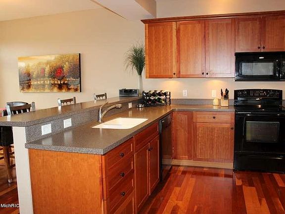 Looking for a dock and boat lift on Spring Lake? This immaculate 3 bedroom, 3.5 bath condo comes with one! This 2,177 finished sq. ft. end unit backs up to the 10th fairway of Spring Lake Country Club, with views of Petty's Bayou. The main floor features an open plan with 9 ft ceilings, gas log fireplace, kitchen with cherry cabinetry and corian counter-tops, dining area with slider to deck, and half bath. The upper level has 2 bedroom suites, each with their own private bath. The lower walkout level is finished with an additional bedroom, full bath, and large family room. There is a 2 stall attached and finished garage with water and additional storage possibilities in attic. Amenities include hardwood and ceramic flooring, master walk in tiled shower,