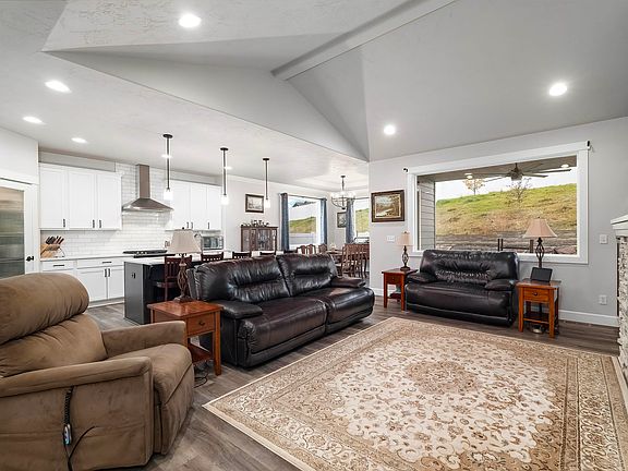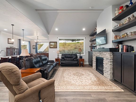 Enjoy this rarely lived in 2021 home with everything you need on one level designed for limited mobility and a large bedroom/ office/ workout area with full bath upstairs. One of the last homes built with gas furnace and fireplace to enjoy the comfort and efficiency for winter warmth. Open concept living area with abundance of natural light and privacy. Custom shelves and outlets on the fireplace wall, too! Gourmet kitchen with gas stove and walk in pantry. Oversized island and large dining area for fun gatherings. The covered and open stamped concrete area is a great place for summer fun. Waterfall and bistro gas firepit to take in the mountain views in your own oasis. Huge ensuite with double sinks. sit in shower, and a large soaking tub to relax in. Over 400 feet upstairs can be used by guests or your own private area with full bath. Bring the toys to the garage or use the 4th bay for snowmobiles or tinkering. Low maintenance landscape with a little garden area for your hobby garden. Drip system in place.