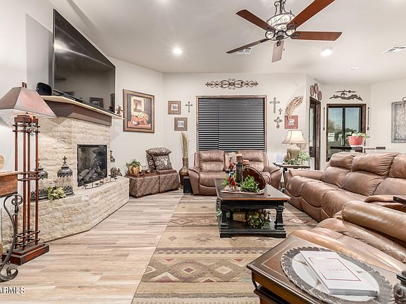 This is your chance to own this beautiful 3-bedroom home on a 1-acre lot with horse privileges! Explore the generous interior, showcasing inviting living spaces with wood-look tile plank flooring, contemporary lighting, a fireplace to keep you warm and cozy, & a soothing palette that makes you want to stay. The gourmet kitchen is a chef's delight, equipped with custom cabinetry, tile backsplash, beautiful granite counters, stainless steel appliances, and an expansive island perfect for entertaining. The main suite is a true retreat, offering a walk-in closet for easy organization & a private bathroom with dual sinks. The backyard is complete with a covered patio ideal for morning coffee and weekend grills, grassy area, &RV gates! RV barn with hookups, workshop, & arena. Bring your toys! for your animals, cars, storage, and projects! Conveniently close to parks and golfing! No HOA! This gem is a must-see!