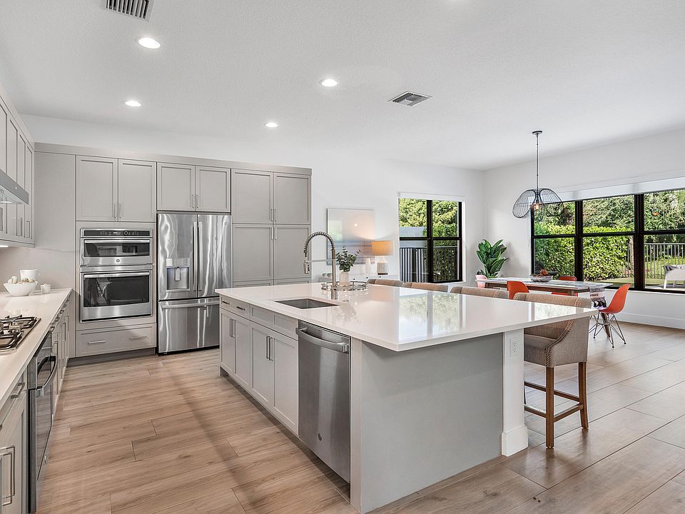 The ''Mariana'' with a POOL (with heater) you have been waiting for! Coastal inspired, fresh & move-in ready, the Mariana stands out from other homes at LOTUS with its bonus room with custom pocket doors. Currently a playroom, this space can be a game/pool table room, a bar, a movie room! Boasting 5 bedrooms, 5 full bathrooms (one bed/bath on 1st floor), large loft area with balcony, second floor laundry room with sink. Oversized pool & deck, pool w/ sun-shelf, child proof pool fence, pool heater, clusia hedge for complete privacy and turf make it for easy living & care free maintenance. Beautiful finishes and upgrades abound including NEW floors leading up & all throughout the second floor, wood-like tile on the first floor, upgraded staircase, volume ceilings, all impact windows & doors The kitchen, the heart of the home, boasts upgraded cabinets with pantry, full Quartz backsplash, a beautiful oversized island with Quartz countertops and seating for plenty! You will love cooking on your natural gas range. A large dining area and the family room with a custom coastal built-in shelving, storage cabinets and decorative fireplace complete this first floor. From the kitchen, dining and family room you look out to the severity of your private pool and backyard.