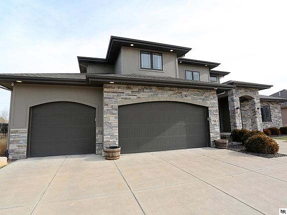 Stunning Tiburon Ridge 1.5 story! Custom built by Nelson Builders, this exquisite executive home features 6 BRs/5 BAs & over 4,200 square feet. Step inside and be wowed by the 2-story great room w/a wall of windows flooding this south-facing home w/natural light. Kitchen is a chef’s dream, w/high-end appliances, granite, & a hidden walk-in pantry. Main floor primary suite features a spa-like ensuite bath w/dual-head walk-in shower & soaker tub. Large main floor office. Upstairs includes a loft flex space & 3 bedrooms w/direct bathroom access (jack-and-jill plus private bath) & walk-in closets. Basement designed for entertaining, w/custom wet bar, stone wall accents, 3/4 bath, and 2 more bedrooms. Fenced back yard w/incredible hardscape, including hot tub, trex deck, fire pit & outdoor kitchen space. Dual HVAC systems, tankless water heater. New Gretna East High, Tiburon golf course, 3 neighborhood parks, and close to I-80. Loaded w/value not found in new construction!