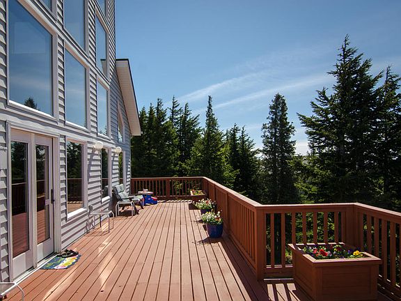 Privacy & Views Galore throughout this impeccably maintained S. Anchorage home. Property borders 30 wild acres and boasts 900 sq ft deck to help invite the outdoors in. Inside this well laid out home are 2 bedrooms on 2nd, 1 on 1st w/potential for 4th or MIL on 1st or 3rd levels. Vaulted ceilings w/huge picturesque windows. Open flowing concept throughout. Cozy wood burning stove in dining rm. Oodles of natural light allowing for airy, energetic vibe. 5-burner gas stove in kitchen, breakfast bar open to main living. Laundry room off kitchen and master for convenience. Hot tub on deck off laundry room to soak in the dreamy views, privacy, Northern Lights, & creek flowing through property. Walk-in closet in master, large master bath with 2 shower head walk-in shower, double sinks. Family room on lower level. HUGE vaulted loft-style bonus room on 3rd level with two storage areas or play cubbies for kiddos. Creek can be heard on property. 2 GAR. 1 extra deep, 1 oversized. 4-bedroom Biocycle septic. This home evokes a true sense of natural ambiance and grace ~ a must see!