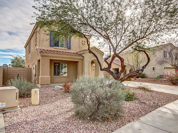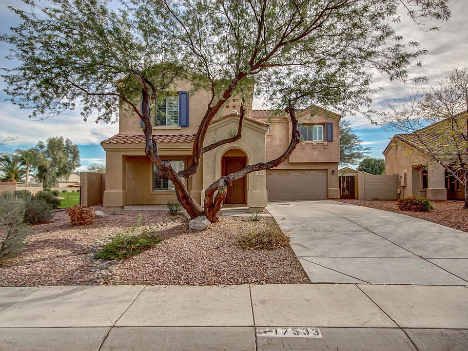Gorgeous 2 story, 3 bed, 2 bath home in Surprise. This is sure to check everything on your list with easy clean tile flooring, updated lighting and plantation shutters, plus more! Large open kitchen has granite counters, black appliances and plenty of raised panel cabinetry for convenient storage. Lower level also has a half bath for visiting guests. Upstairs holds roomy spare rooms and plenty of natural lighting. The master retreat has a sitting room/office and attached full bath with generous walk-in closet. Oversized yard with meticulous desert landscaping and shade trees, plus a covered patio. This home is sure to go quick, so call now for a showing!
