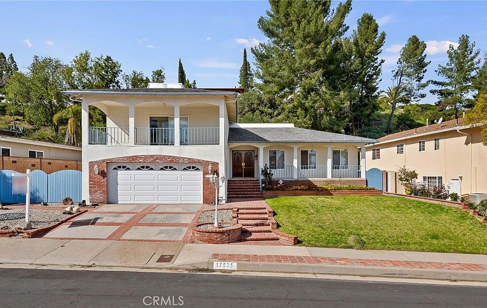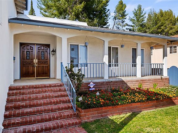 This home offers a fabulous opportunity to live in one of Granada Hills most desirable neighborhoods. Located north of Rinaldi and west of Balboa the area offers quiet living, excellent hiking trails and convenient access to many fine dining options. The front of the home includes extensive brickwork which includes the fascia, entry stairs and brick trimmed driveway. Welcoming you past the double wood entry doors is a rare and lovely tri-level floor-plan with over 2,500 square feet, 4 bedrooms and 3 bathrooms. Interior highlights include a kitchen with a double oven, four burner cooktop and dual basin sink. The large family room features a stone fireplace and built-in bookshelves with cabinetry below. Dining options include a breakfast area in the kitchen as well as a separate formal dining room. Lots of natural light fills the elegant living room. The spacious primary bedroom features mirrored wardrobe doors, a covered deck and private bathroom. The downstairs bedroom makes for a perfect home office or guest quarters with an adjacent bathroom. While touring the home you'll find dual pane windows, newer sliding glass doors and ceiling fans. While sitting on the rear deck you'll enjoy the view of an entertainer's dream yard offering a huge grass area and excellent privacy provided by block walls.