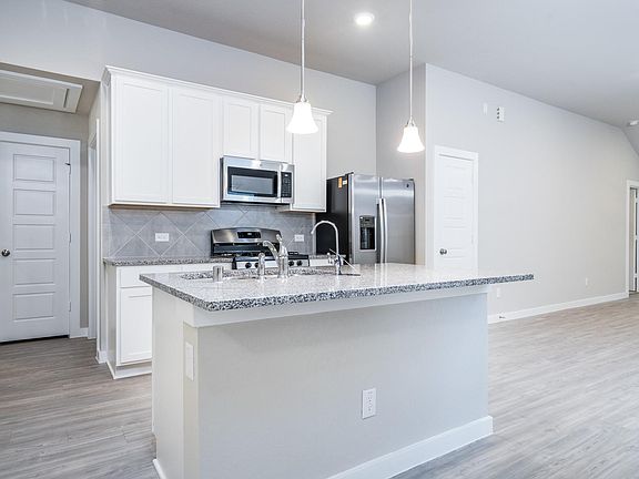 Private backyardGranite countertopsWood looking vinyl planksGorgeous kitchenModern cabinets