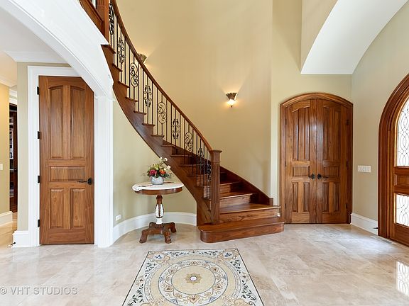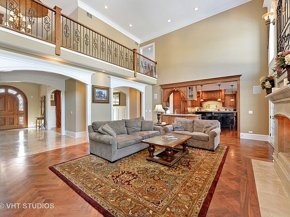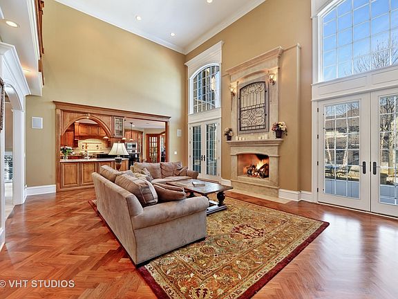 Craftsmanship and quality exude from this sprawling residence in Banchory Woods. First floor boasts dramatic ceiling height, and marble tiled foyer. Great room has two story windows, masonry fireplace, and custom built-ins. Extensive millwork and walnut floors throughout. An exquisite gourmet kitchen, with custom brakur cabinetry, high end appliances, and eat in breakfast area. Hearth room off kitchen with custom french doors, vaulted ceiling, stone fireplace and walnut panels. Library features coffered ceiling and matching custom cabinetry, wainscoting, crown, and baseboards. Guest BR/full bath on first level. 4 spacious bedrooms upstairs with 4 baths, including Mstr Bedroom with 13' tray ceiling, huge walk in closet, master bath with spray shower, sep jet tub, double vanity. Finished basement with heated floors, large recreation room, fireplace, media room, and fitness room. 1st and 2nd lvl laundry, 3 car heated garage, wired throughout for security and media.