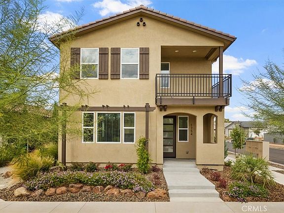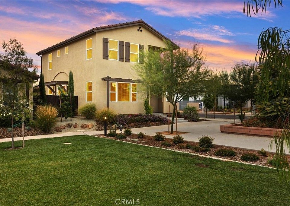 Welcome to your dream home! This stunning Spanish-style, two-story residence boasts 1,560 square feet of beautifully designed living space. Featuring three bedrooms and two and a half baths, this home offers comfort and functionality. The 1st floor is an open floorplan with sliding doors out to the patio from the living area, kitchen and island, built in desk, large storage room under the stairs, a utility room with laundry, storage and a half bathroom. All bedrooms are located upstairs ensuring privacy and tranquility. The primary bedroom opens to a charming covered patio balcony, perfect for enjoying your morning coffee or evening sunset views. The fully finished side yard is an outdoor oasis with a patio, pebble accents, and a garden bed already plumbed for irrigation - ideal for the gardening enthusiast. The detached two-car garage, along with an additional private uncovered parking space, ensures plenty of room for vehicles and storage. Situated facing a lush, grassy landscaped courtyard maintained by the city, you'll enjoy serene views without the hassle of HOA fees. Built in 2022 by Pat Burns, this home combines modern amenities with timeless design. Nestled in the master-planned community of Meriam Park, you'll have everything you need within walking distance, including coffee shops, restaurants, live music and more. Discover the perfect blend of convenience and luxury in this exceptional property.