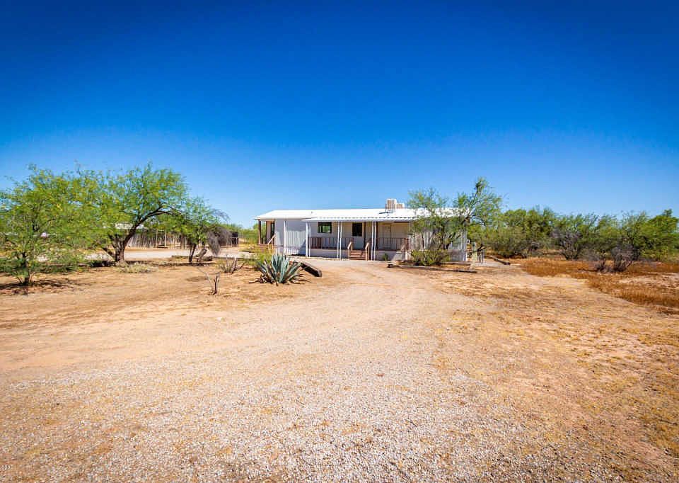 NO HOA! Situated on over an acre of land & surrounded by natural desert. Very private setting w/front porch entry. Dramatic soaring ceilings, crisp palette, plush carpet, ceiling fans, & neutral vinyl floors. Breakfast bar, dining area w/outside access, & plenty of two-tone kitchen cabinets. Generous sized bedrooms, ample closets, & 2 baths. Interior laundry room for your convenience. Fenced dog run & storage sheds. Brand new carpet, newly coated roof and cooler serviced prior to listing. Easy home to make your own! Lot will allow for additional home. Bring the kids, mom, dad or in-laws!