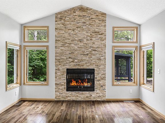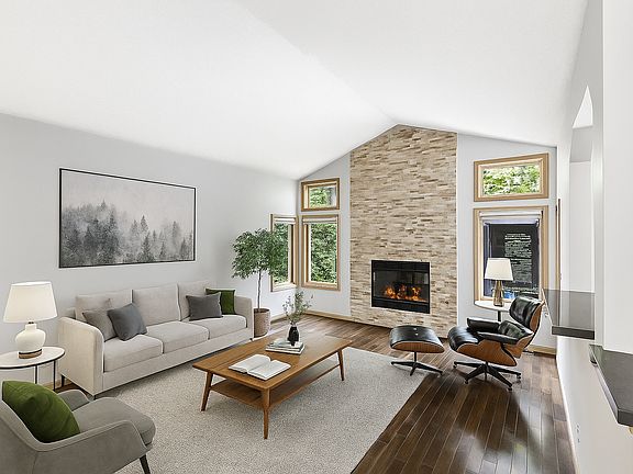 The home features 4 bedroom & 3 bathrooms, and stunning vaulted ceilings anchored by a cozy fireplace on the main level. The open concept provides excellent entertaining space or day to day living with spectacular nature views from every angle. Some of the many high-end finishes throughout include Cambria countertops, tile flooring, & new Village Flooring carpet.