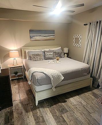 Breathing views of the most beautiful beaches! Step into this completely upgraded 2 bed 2 bath condo with a queen gel Sleeper sofa . Sleeps 6 comfortably. Upgrades include sleek shiplap walls ,new bath countertops and drop in sinks with farmhouse mirrors and lighting. New walk in shower. All lighting replaced and ceiling fans . Nautical rope bar kick wall . Added crown moulding and fresh paint . Glass panel barn pantry door for extra special touch . You will be swept away when you look through these balcony doors in living room and master bedroom. This stunning 300 Sq ft balcony seats 12 and the view!!!! Well it speaks for itself! This is a low floor unit so you can take the steps up if needed . Parking garage under building is a plus and 2 huge pools and sauna and hot tub and steam room ..immaculent property! 3 owners closets . Must see!