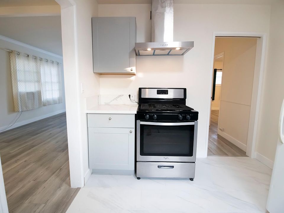 Beautifully updated, bungalow-style unit with a sweet little private backyard area, located on a quiet street in the heart of Granada Hills. This spacious one-bedroom unit is freshly painted, and has new, stylish flooring installed everywhere. It features a huge, light-filled living room with a designated dining area. The kitchen has been completely remodeled and received new cabinets, countertops with sophisticated marble-like design, and new stainless appliances. The fully updated bathroom features a bathtub and beautiful marble-like design that is consistent with the kitchen's look. There is good closet space in the generous size bedroom as well as in the hall area. Washer and dryer can be found in the separate laundry room that opens from the kitchen. Please note: The base rent is $2500. There is a promotional discount of $500/month for one year. Renter is responsible for all utilities..